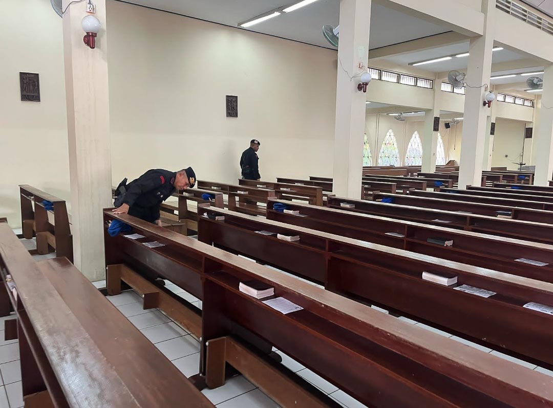 Sterilisasi dilakukan secara menyeluruh, mencakup bagian dalam gereja, halaman, hingga area parkir. Tim Jibom bekerja sistematis dan teliti untuk memastikan tidak ada potensi ancaman yang membahayakan jalannya ibadah.